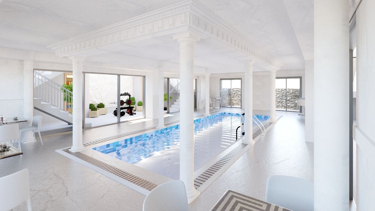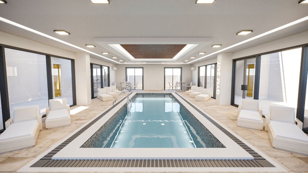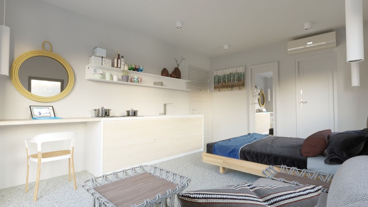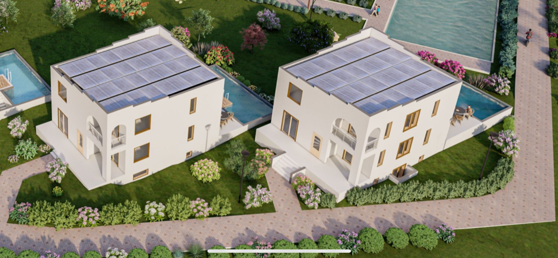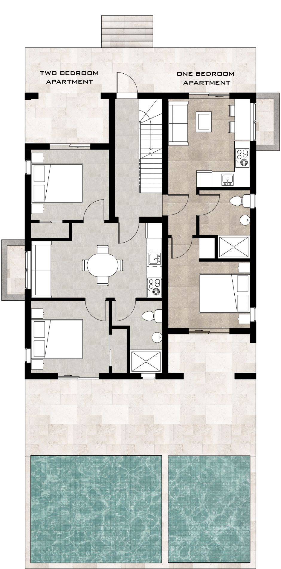 APARTMENTS: The apartment buildings have two floors with a basement. The proposed apartments are three, two or one bedroom. The ground floor apartments have a large terrace and private pools. In addition, we have designed studio buildings: There are two categories of studio buildings. In one there are 5 apartments, three on the first floor and two on the ground floor. On the ground floor there is an additional common area for this building, with a kitchen and a small cafeteria and a large outdoor swimming pool, which will serve the 5 apartments. In the other building with 6 studios: three on the first floor and three on the ground floor. One studio has a private pool.